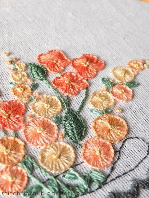 Satin stitch: The satin stitch is used to fill in large areas with solid color. It is a stitch that is worked back and forth across the fabric to create a smooth, even surface.